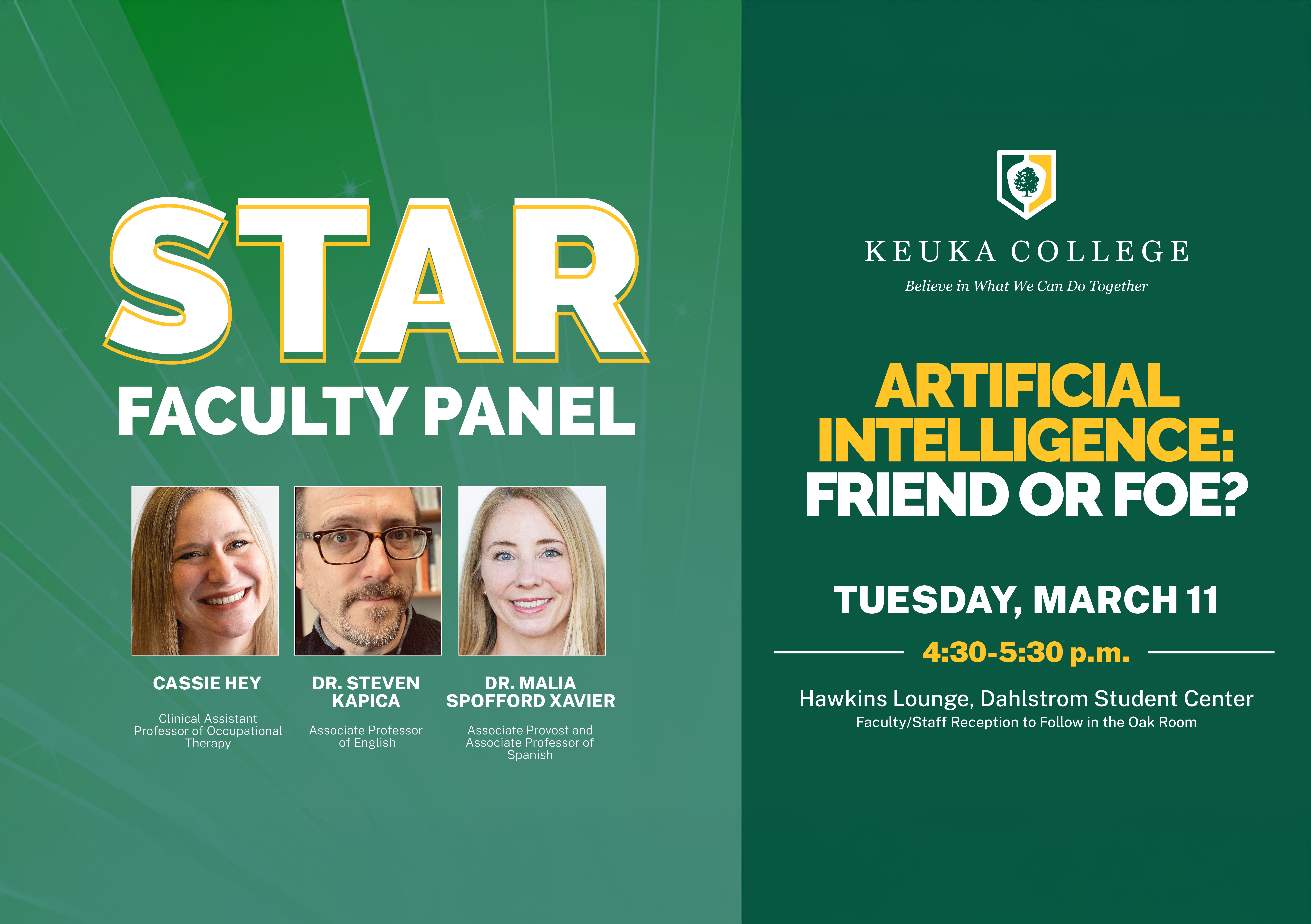“Artificial Intelligence: Friend or Foe?" will be the topic when this semester’s STAR Faculty gather for a public discussion on Tuesday, March 11, in the Hawkins Lounge of the Dahlstrom Student Center.