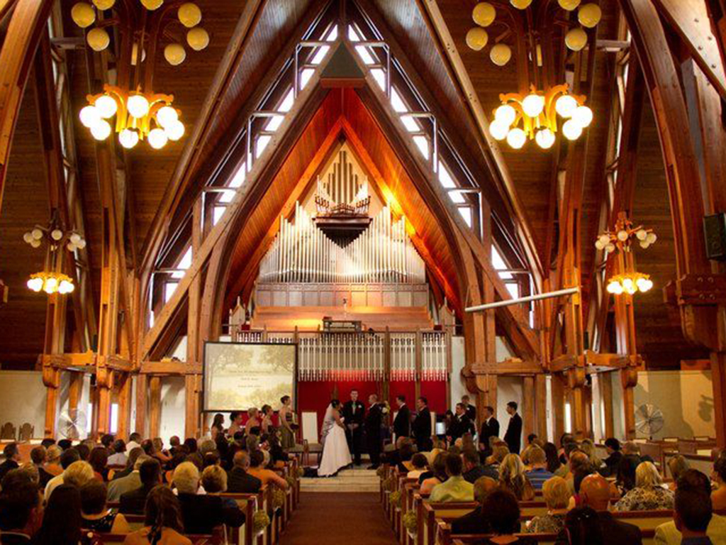 “The chapel at Keuka College, in upstate New York, is a campus landmark,” writes Atlantic staff writer Alia Wong for the story, “The College Campuses That Moonlight as Wedding Venues.” “Its Douglas-fir trusses, Italian-glass chandeliers, and custom-made pipe organ are so charming that many alumni choose to get married there.”