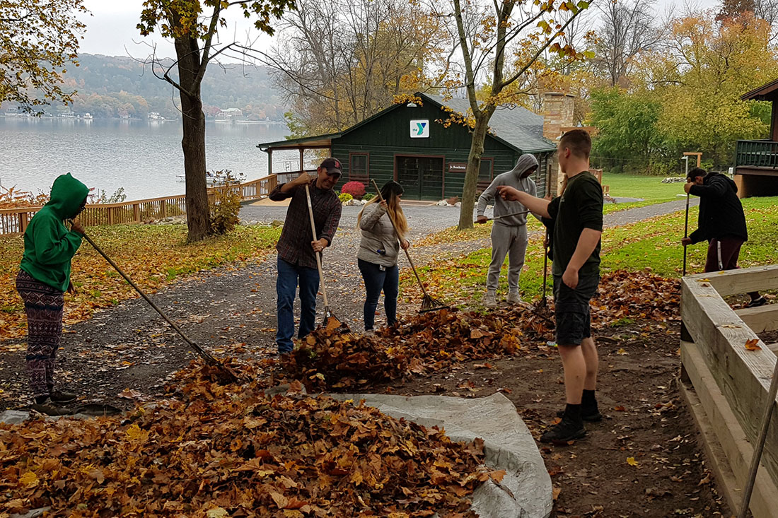 These Keuka College students, raking leaves at Camp Cory, were among the 44 members of the College community participating in Make a Difference Day.